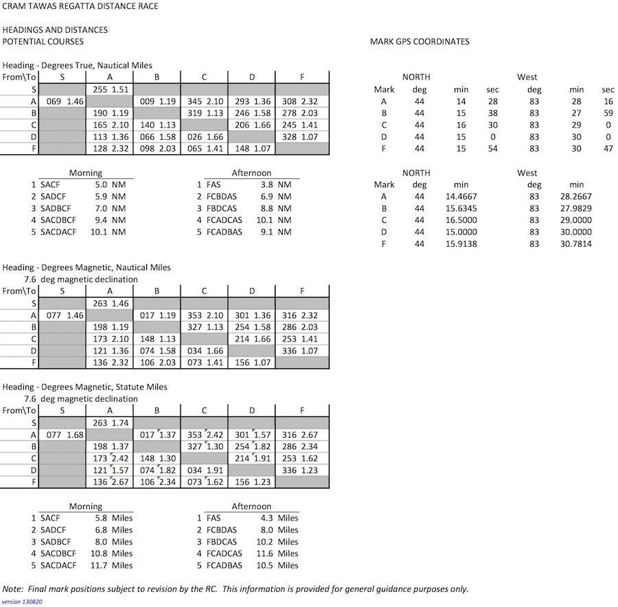 Click the picture to view the marks overlaid on Google maps. If you'd like to download the waypoints to your GPS device, the GPX file is here (right-click the link and select 'Save As'). Finally, we made a quick reference sheet for the possible courses and mark positions available at this link.